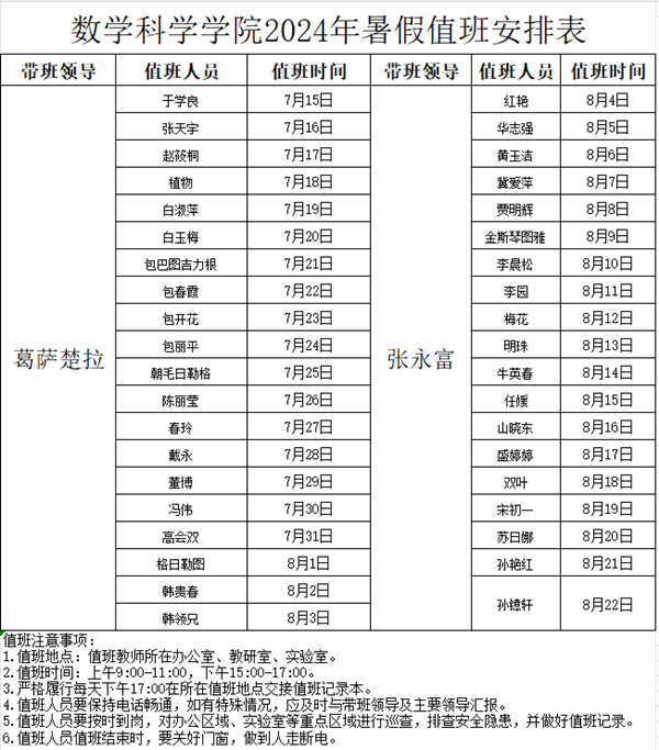数学科学学院2024年暑假值班安排表
