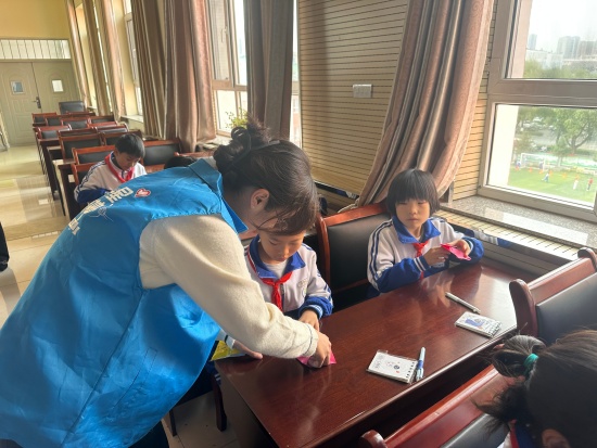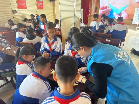最后进行了手工实践环节。志愿者们分发彩纸,耐心指导孩子们折叠立体五角星。“每一个角都要对齐,就像我们的国家需要大家同心协力。”在志愿者的帮助下,一个个色彩鲜艳的五角星逐渐成型,孩子们小心翼翼地将作品捧在手中,脸上洋溢着自豪的笑容。