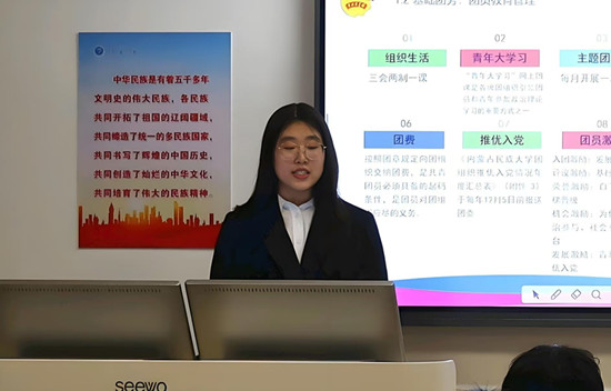 团课中,格根塔娜详细介绍了“三会两制一课”制度、团员发展流程及智慧团建操作,强调了团组织生活在思想引领与素养提升中的重要作用;解读了“第二课堂成绩单”制度与“到梦空间”APP的使用方式,鼓励同学们积极参与各类实践活动,全面提升综合素质;此外,她还围绕推优入党、五四表彰、团员教育评议三项关键工作展开说明,清晰界定推优入党的资格条件与流程、五四表彰的评选维度、团员教育评议的实施标准,为新生勾勒出团员成长的“进阶图谱”。