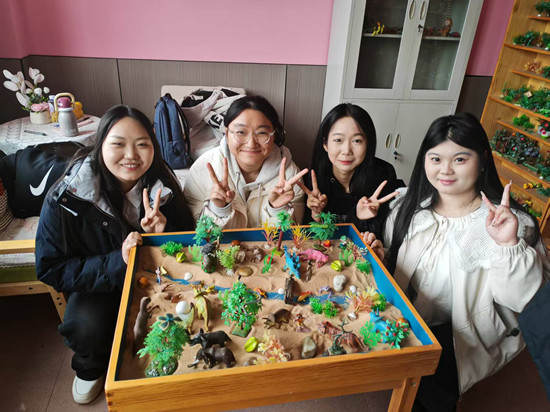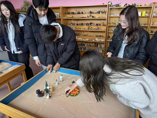 活动中,中心老师先详细讲解沙盘游戏规则,通过温和的引导营造安全放松的氛围,让同学们卸下心理负担,得以完全舒展自我。进入创作环节,同学们自由挑选人物、动物、建筑等各类沙具,在沙盘中反复摆放、调整,共同构建专属于自己团队的“沙盘世界”。整个过程中,老师始终默默陪伴,不干预、不评判,现场氛围和谐轻松,同学们也在专注的创作里,悄然探索着自身的需求与困惑。待“沙盘世界”创作完成,同学们主动分享沙盘中的故事与想法,老师则适时引导大家解读沙具背后的深层意义。