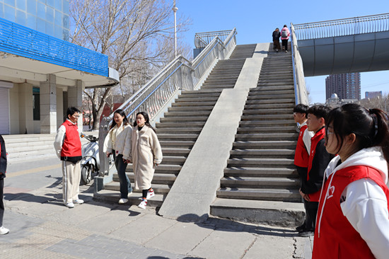 志愿者们分时段,在紧邻西拉木伦校区南门的天桥上下口处,劝导学生不要横穿马路。志愿者们以身作则引导往返西拉木伦校区及霍林河校区同学走天桥通行,规范个人行为,同时倡导大家在过天桥时不要嬉戏打闹、乱扔垃圾等。