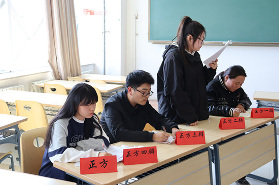 本次辩论赛采用四对四团体辩论制,设开篇立论、相互攻辩、自由辩论、总结陈词四个阶段。比赛开始,各参赛队就“推广使用普通话学校教育更重要”和“推广使用普通话社会推广更重要”为辩题展开激烈的讨论。双方辩手分别就各自观点立证陈词、旁征博引,时而举例示范,时而引经据典,一攻一守之间,呈现出一场有理有据的精彩辩论。在相互攻辩环节,正反两方更是气势如虹,双方选手各抒己见、妙语连珠;自由辩论环节则将现场激烈争辩的氛围推向高潮,正反双方辩手轮流上场,观点令人耳目一新。随着双方四辩的精彩总结,辩论赛圆满落下帷幕。