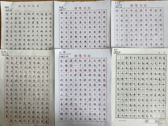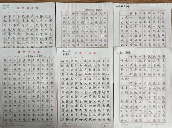 活动中,党支部党员对师范类专业全体学生近一周的朗读作品和钢笔字作品,从国家通用语言文字的标准发音、朗读的内容、钢笔字的笔画结构、完成作品的态度等多个方面进行了认真细致的评价。在检查过程中,对同学们作品进行筛选、分类等级,并对朗读不认真、未朗读规定的铸牢中华民族共同体意识相关内容、钢笔字书写不认真、不规范的同学进行了一对一反馈,提供了客观的改进建议。