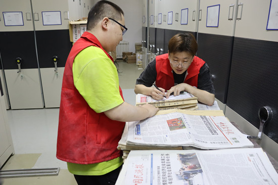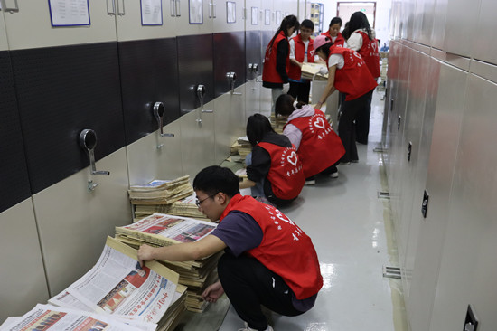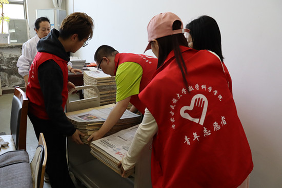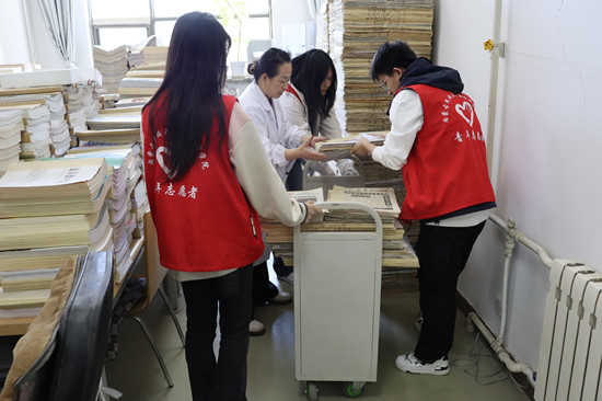 活动中,在图书馆老师的指导下,同学们对2019年至2023年日报进行了分类整理。随后,从图书馆二楼将日报搬运至一楼书库,并上架摆放。在劳动过程中,大家相互协作,默契配合,展现了高度的团队合作精神。