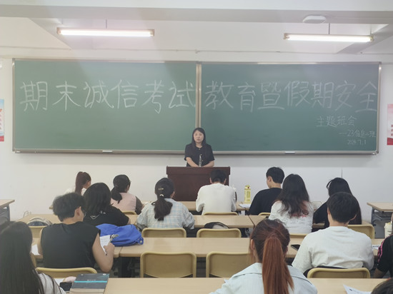 会上,班主任、辅导员老师传达了学院关于严肃期末考试考风考纪的有关要求,对考试安排、考试注意事项、考试作弊行为处理规定等方面进行详细解读,要求全体学生要自觉树立正确的考试观,自觉遵守考试纪律,坚决杜绝作弊行为,共同营造良好的考风和学风。随后,对暑假期间的人身安全、交通安全、网络安全、心理健康、意识形态等安全方面进行强调,提醒同学们注重防范各类风险,杜绝各类安全事故发生,度过一个充实、快乐、有意义的假期。
