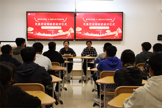 为加强各民族广泛交往交流交融,促进各民族学生在理想、信念、情感、文化上的团结统一,守望相助,2024年9月26日,数学科学学院与物理与电子信息学院在知行楼A413开展“民族团结姊妹班签约仪式”活动。会议由数学科学学院辅导员赵筱桐老师与物理与电子信息学院辅导员郭东宏老师主持,“民族团结姊妹班”结对班级的学生代表参加本次活动。