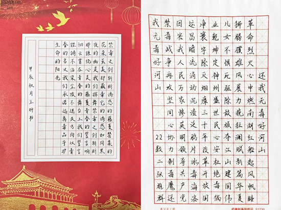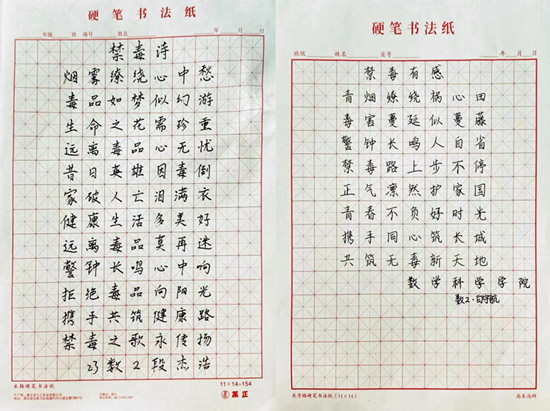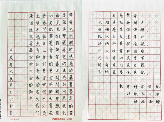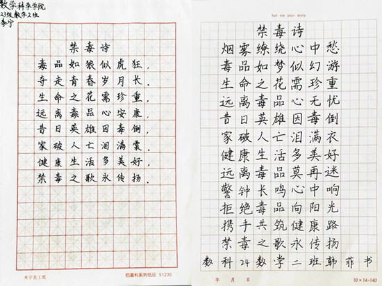 为进一步加强校园毒品预防教育,提高学生的禁毒意识和自我保护能力,10月9日—10月12日,数学科学学院举办了禁毒书法作品征集活动。