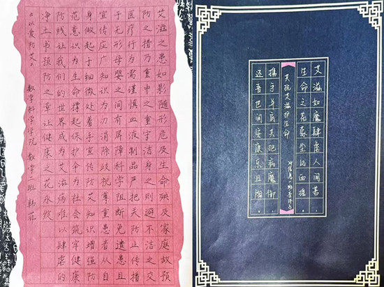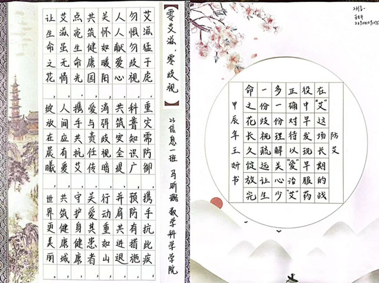 为了弘扬中华优秀传统文化,提升学生们的艺术修养和创新能力,同时加强艾滋病预防知识的宣传,11月1日—11月10日,数学科学学院举办了“丹青映艾”主题书法比赛。