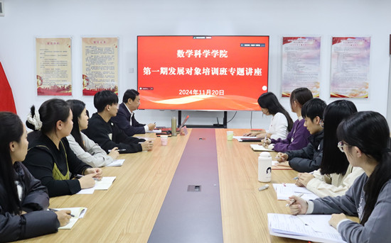 为进一步作好新形势下党员发展工作,加强对党员发展对象的培养和教育,提高理论水平,端正入党动机,数学科学学院于11月20日晚上在西拉木伦校区知行楼A515会议室开展了发展对象培训班专题讲座,邀请管理学院教授胡其图老师担任主讲。数学科学学院党委书记葛萨楚拉及全体发展对象参加,讲座由学生第一党支部书记朝毛日勒格主持。