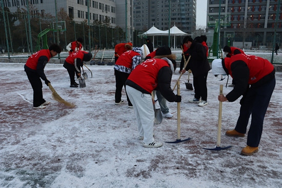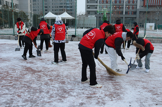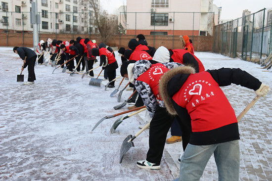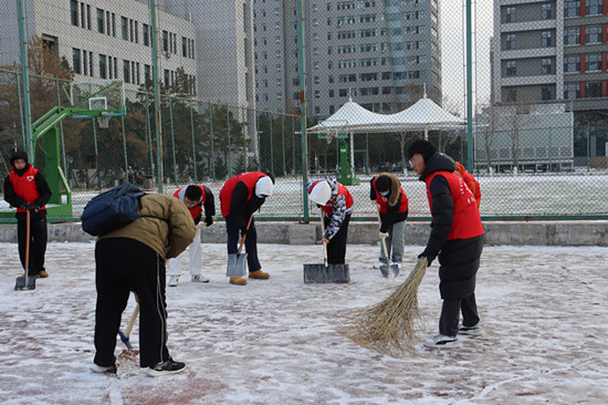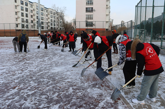 志愿者们身着红色马甲,手持铁锹、镐头、扫帚等工具,前往西拉木伦校区操场分担区开展扫冰除雪工作。除雪现场,志愿者们分工明确,有的负责铲除积雪,有的负责清扫路面上的碎冰,还有的负责将清理出的积雪和冰块运送到指定地点。尽管天气寒冷,但志愿者们的热情却丝毫未减,他们相互协作,共同奋战,为校园的安全和整洁贡献着自己的力量。经过两天的奋战,学院所属分担区的积雪得到了有效清除,志愿者们用自己的实际行动践行了全心全意为师生服务的宗旨,展现了新时代青年的责任与担当。