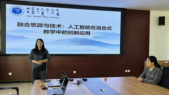 在数字化时代背景下,课程思政融入和人工智能(AI)技术的运用正深刻影响着教育领域,特别是在混合式教学的应用上展现出巨大潜力。为了将课程思政与人工智能技术相结合,实现更有效的教学设计和实施,由教师发展中心主办、数学科学学院承办的2024年第十四期(总196期)教学沙龙活动,于2024年12月4日下午在西拉木伦校区知行楼A517室举行。学院杨丹丹老师为发起人,活动以“融合思政与技术:人工智能在混合式教学中的创新应用”为主题,杨老师分享了她在上海交通大学参加数智赋能教学创新培训的心得和体会。学院各系主任、教研室主任以及学院部分教师代表参加了本次活动,活动由学院副院长张永富主持。