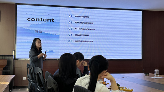 杨丹丹老师首先介绍了课程思政的内涵,强调了通过挖掘学科内的思想政治教育元素来实现育人目标的重要性。在教学设计方面,杨老师介绍了如何通过布鲁姆教育目标分类法来制定具体清晰的教学目标。进一步地,她着重指出课程思政素材的多元化来源,为老师们拓宽了教学视野。此外,杨老师详尽展示了人工智能技术在混合式教学中的创新应用。活动中,与会教师还围绕AI教育的潜在挑战与风险展开了热烈讨论。