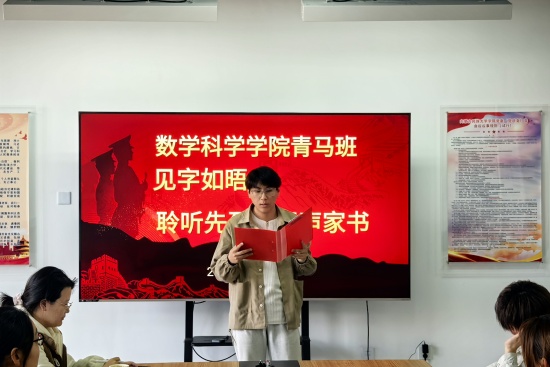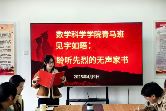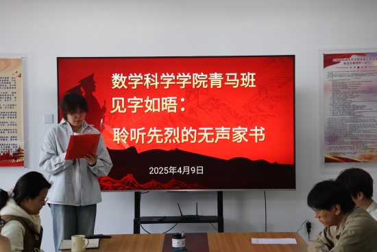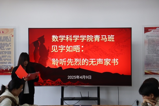 为让学生深刻领会英烈精神,缅怀先烈英勇事迹,4月9日,数学科学学院青马班在西拉木伦校区知行楼A515会议室召开了“见字如晤·聆听先烈的无声家书”主题活动。活动由学院辅导员赵筱桐老师主持,青马班全体成员参加。