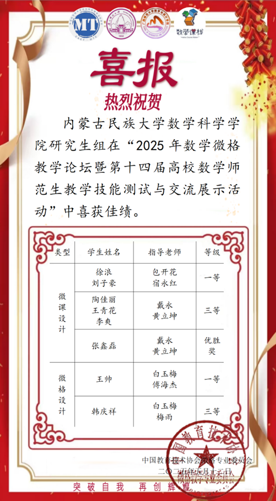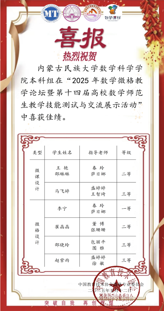 此次佳绩彰显了学院“以赛促教、以赛促学”的育人理念,通过竞赛反哺课堂教学改革,强化师范生信息化教学能力与创新意识。未来,学院将持续深化与基础教育一线合作,构建“职前职后一体化”教师培养体系,为新时代数学教育输送高素质师资力量。