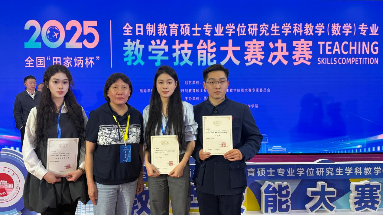 2025年全国“田家炳杯”全日制教育硕士专业学位研究生学科教学(数学)专业教学技能大赛决赛于10月25—26日在西华师范大学举行。本次大赛初赛共有来自全国120所高校的548位选手参加,最终来自113所高校的280位选手进入决赛。经过激烈的角逐,我院23级学科教学(数学)专业李爽同学和刘子豪同学荣获三等奖、24级学科教学(数学)专业杨颜溪同学荣获优秀教学设计奖,为我院赢得了荣誉。