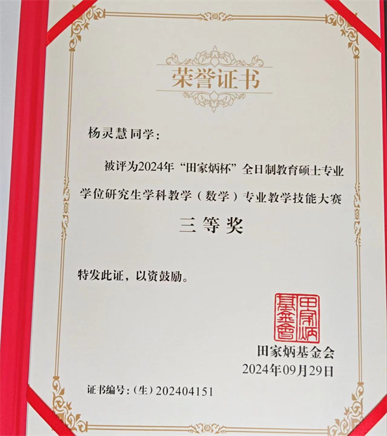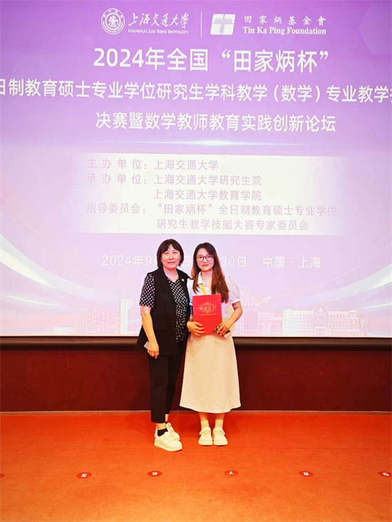 2024年全国“田家炳杯”全日制教育硕士专业学位研究生学科教学(数学)专业教学技能大赛决赛于9月28—29日在上海交通大学举行。本次大赛初赛共有来自全国113所高校的498位选手参加,最终来自106所高校的255位选手进入决赛。经过激烈的角逐,我院白淑萍老师指导的23级学科教学(数学)专业杨灵慧同学荣获三等奖,为我院赢得了荣誉。