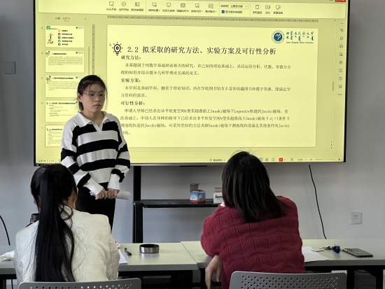 会上,2023级数学专业11名研究生依次从课题的研究背景、研究意义、研究目标、研究方法以及进度安排等方面进行了详细阐述。与会专家针对开题存在的问题进行了针对性的提问,对选题和研究方案等提出了建设性的意见,并对11名同学的课题进行商议,一致同意11名同学的课题通过论证,同意开题。