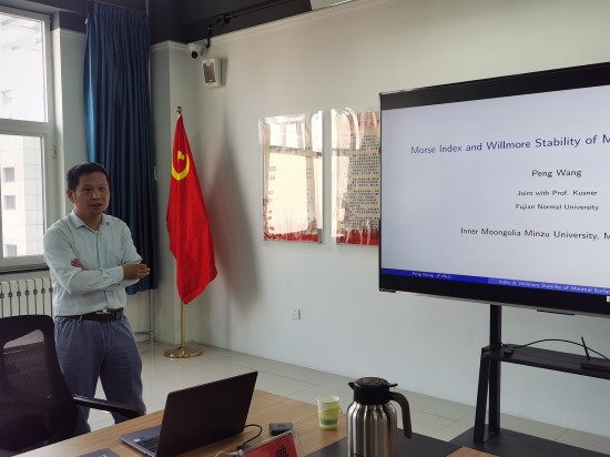 2025年5月26日上午,数学科学学院邀请福建师范大学数学与统计学院教授、闽江学者特聘教授、博士生导师王鹏教授,带来 "Morse Index & Willmore stability of minimal surfaces in Sn"主题报告。此次报告在西拉木伦校区知行楼A515会议室进行,学院几何方向教师和全体学硕研究生参加本次报告会,会议由副书记包图雅教授主持。